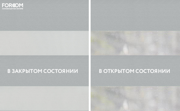 Полотно ткани, состоит из чередующихся горизонтальных полос – прозрачных и непрозрачных. Изменяя положение этих полос относительно друг другу, можно создать целых 3 режима регулировки светом. Например, чтобы в помещении стало светлее, нужно расположить прозрачные полосы друг напротив друга. Если разместить прозрачную и непрозрачную полосу параллельно друг другу, то можно добиться практически полного затемнения.